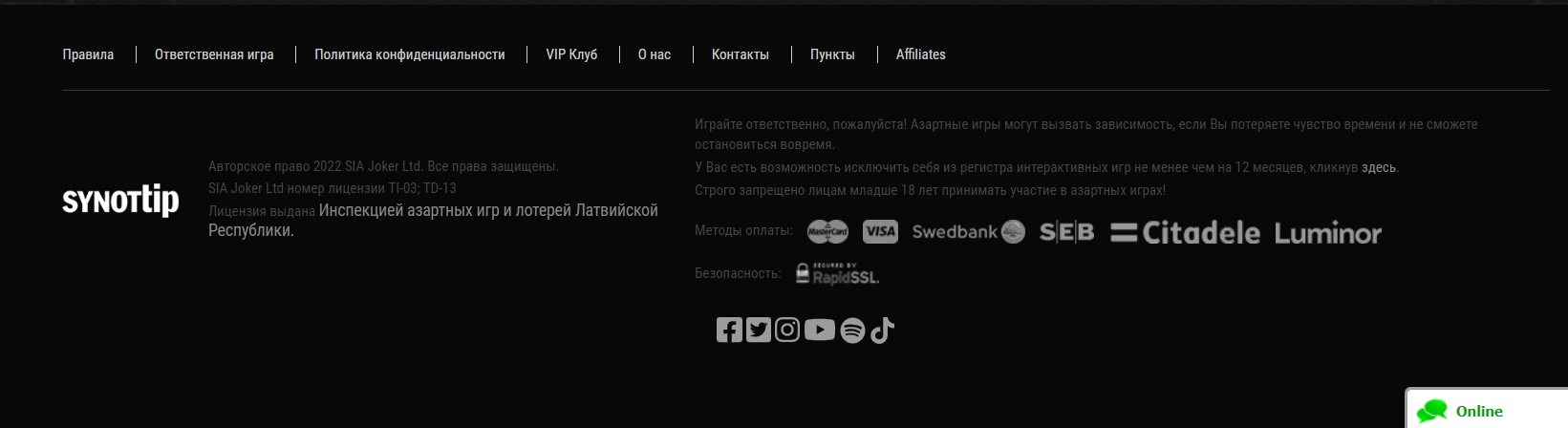 Онлайн-платформа Synottip осуществляет лицензированную игровую деятельность на протяжении более чем 20-ти лет. В качестве ее собственника выступает компания Joker Ltd, основание которой пришлось на 1995 год.