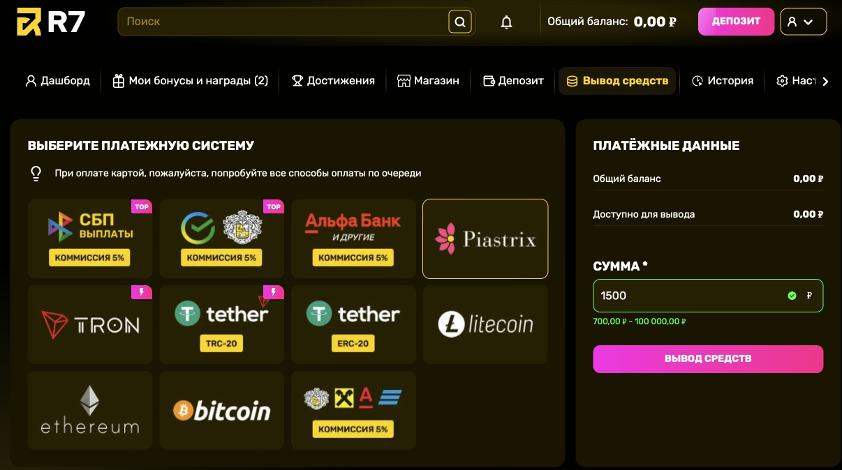 Ассортимент платежных систем, используемых в онлайн казино R7 под снятие денег, охватывает банковские карты, телефонные системы платежей и криптовалюты.