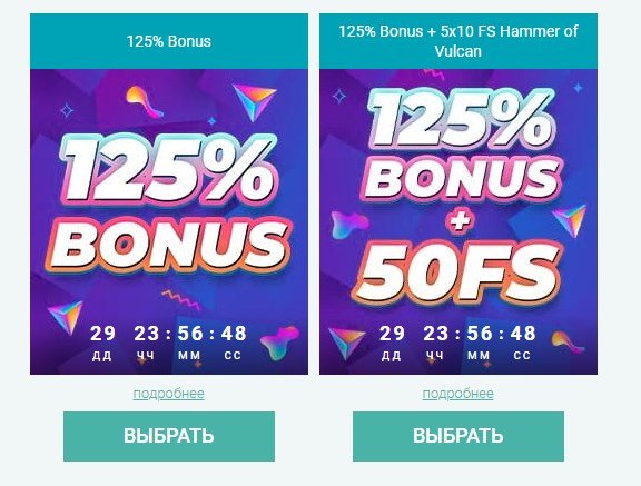 В первом варианте вы получите бонус в размере 125% от первого депозита, а во втором дополнительно 50 фриспинов. Но второй вариант сложнее отыграть, но и награда больше.