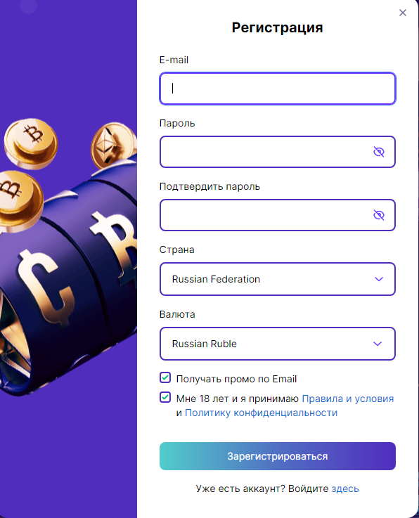 На сайте Cryptoboss Casino имеется всего 1 способ создать новый аккаунт.