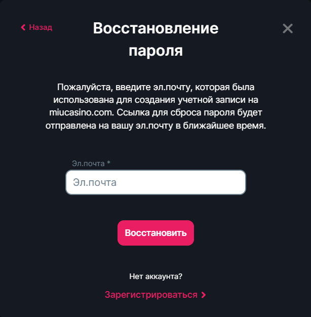 Авторизация на сайте Miu Casino возможна при помощи единственного способа через адрес электронной почты, что подводит нас к недостатку казино в виде отсутствия входа через соцсети и мессенджеры, которая считается самым быстрым способом входа в личный кабинет.